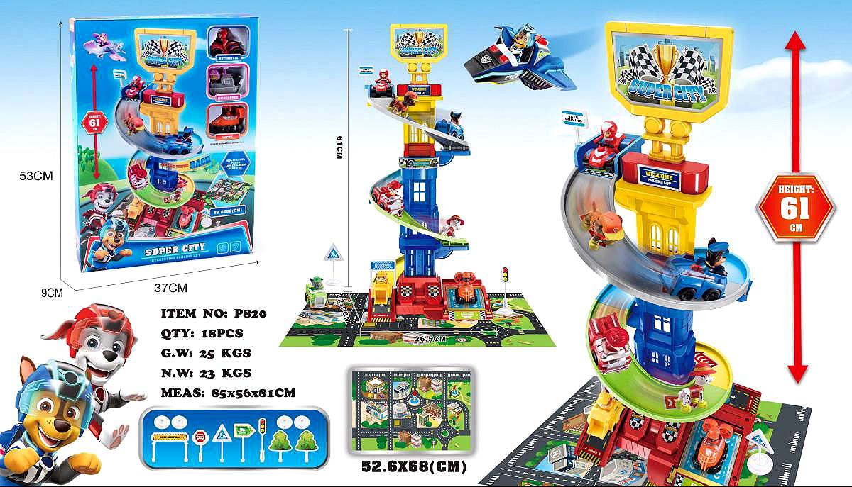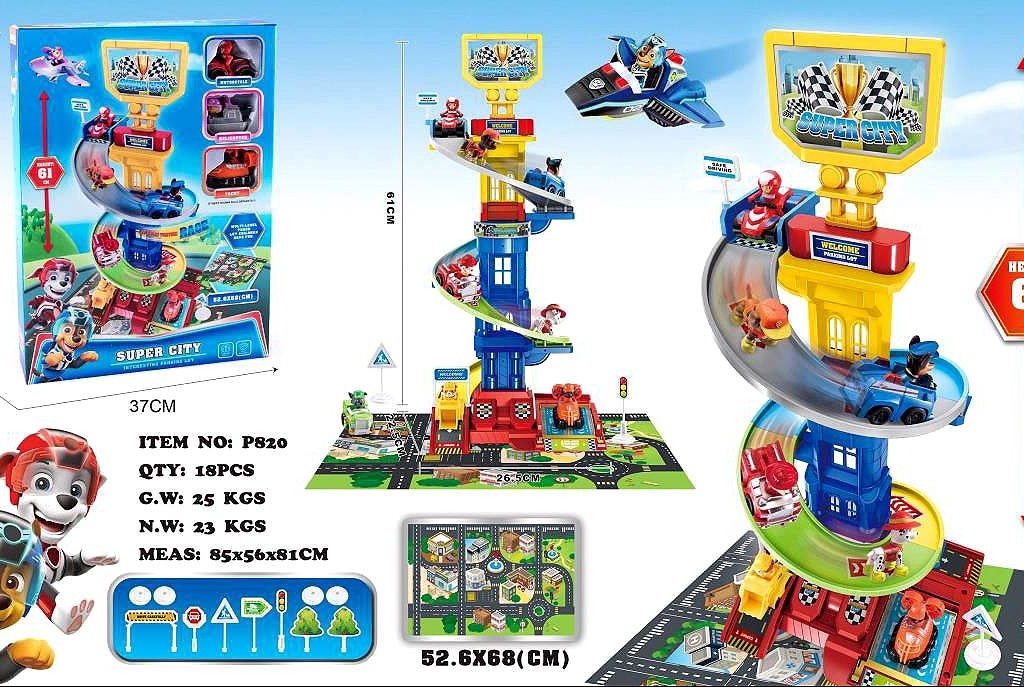برج مسابقهای Super City مدل P820 یک اسباببازی هیجانانگیز با ارتفاع 61 سانتیمتر و مسیر مارپیچ بلند است. این مجموعه 18 قطعه شامل ساختمان چندطبقه، ماشینها، تابلوهای راهنمایی و زمین بازی 52.6×68 سانتیمتر دارد.